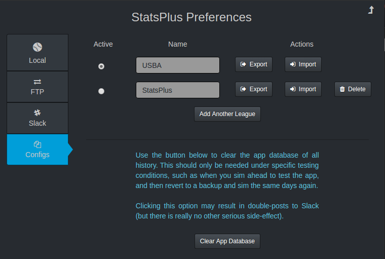 The radio selection under "Active" is used to switch between league configs. Choosing a new option here will back up the current league config,