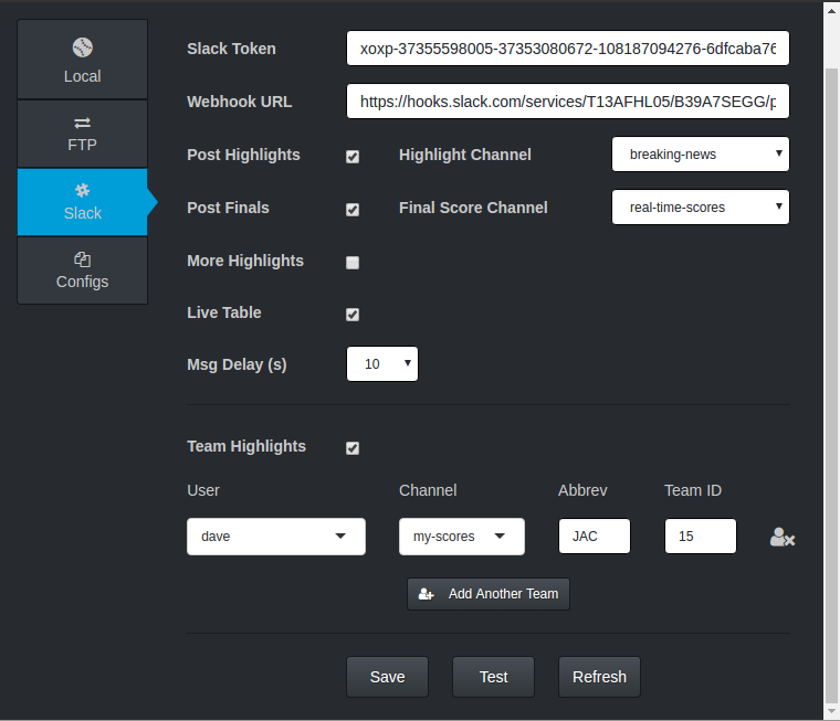 If enabled, the app will watch for every score change and highlights for the users entered, and post them to a channel intended to be dedicated for that user/team. This is very verbose, and should only be enabled for teams that want to get multiple messages for every change.