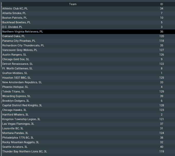 You can also see all the human-controlled team IDs in the Commissioner Office, when clicking on "Check Team Exports". Screenshot of an example with list of teams and their IDs: